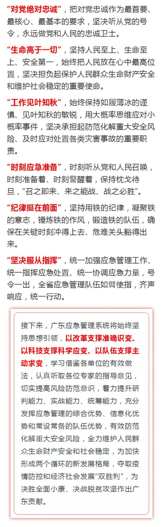 忠实践行对党忠诚、纪律严明、赴汤蹈火、竭诚为民“四句话方针”,不断强化思想淬炼、政治历练、实践锻炼、专业训练,全省应急管理干部落实“特别讲政治、特别讲纪律、特别讲科学、特别讲认真、特别讲精神”的“五个特别”要求,并在此基础上以“六条具体要求”,着力锻造党和人民信得过的准军事化队伍。