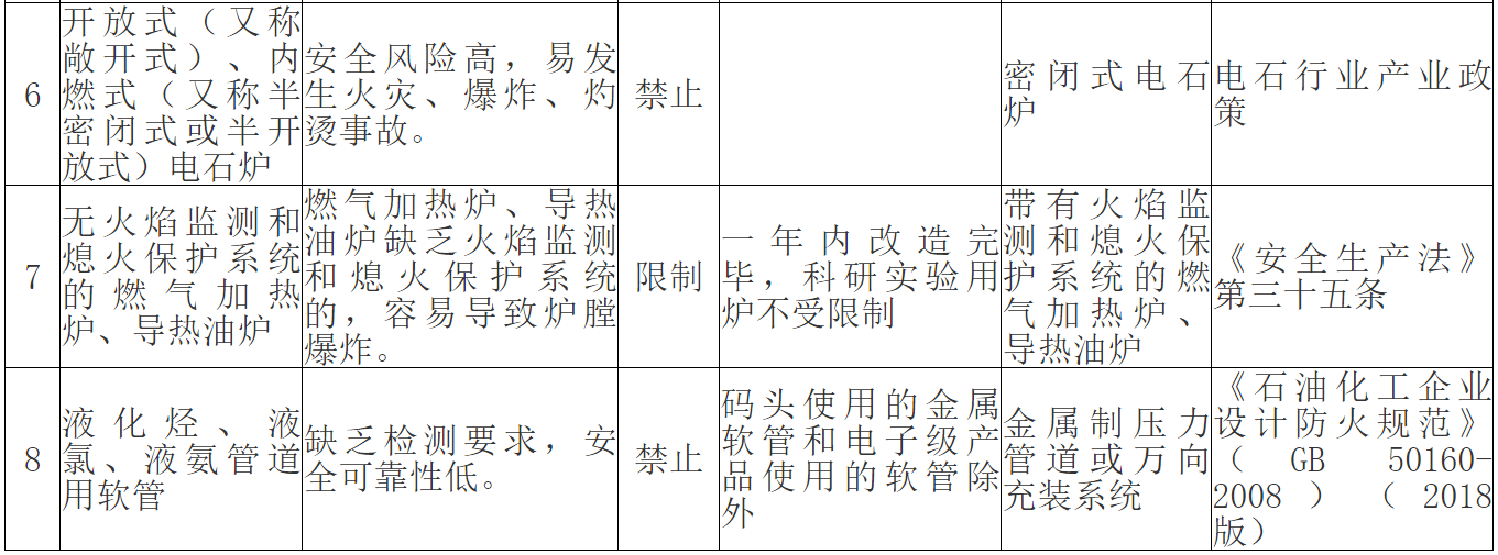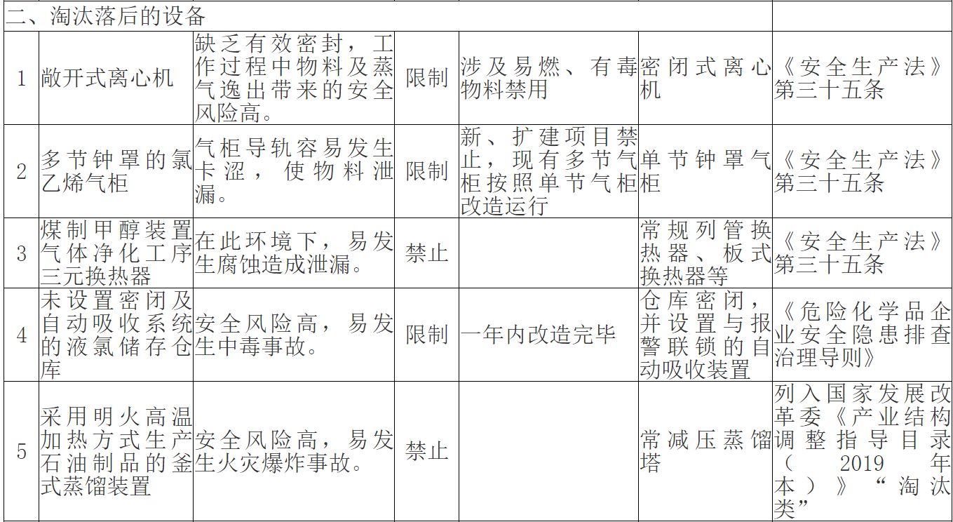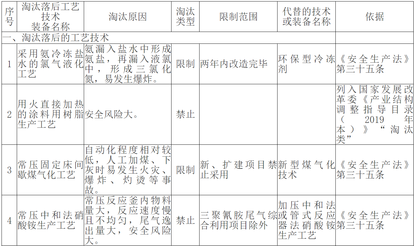 为认真落实《安全生产法》和中共中央办公厅、国务院办公厅《关于全面加强危险化学品安全生产工作的意见》以及国务院安委会《危险化学品安全专项整治三年行动方案》,加快淘汰落后的危险化学品安全生产工艺技术装备,提升企业本质安全水平,防范化解重大安全风险,应急管理部制定了《淘汰落后危险化学品安全生产工艺技术设备目录(第一批)》(见附件),现予印发,请遵照执行。