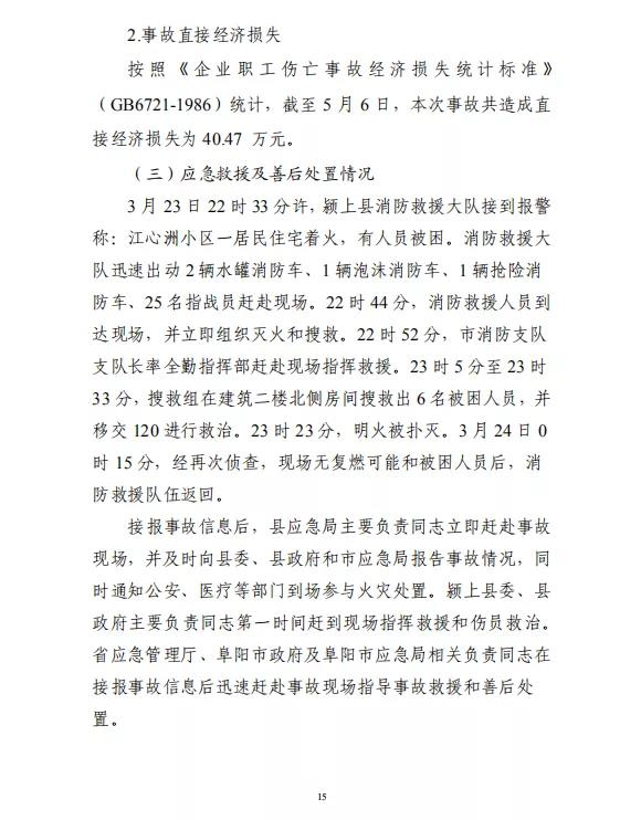2020年3月23日22时9分许,安徽阜阳市颍上县慎城镇江心洲社区发生一起较大火灾事故,造成5人死亡、1人受伤。直接经济损失40.47 万元。
