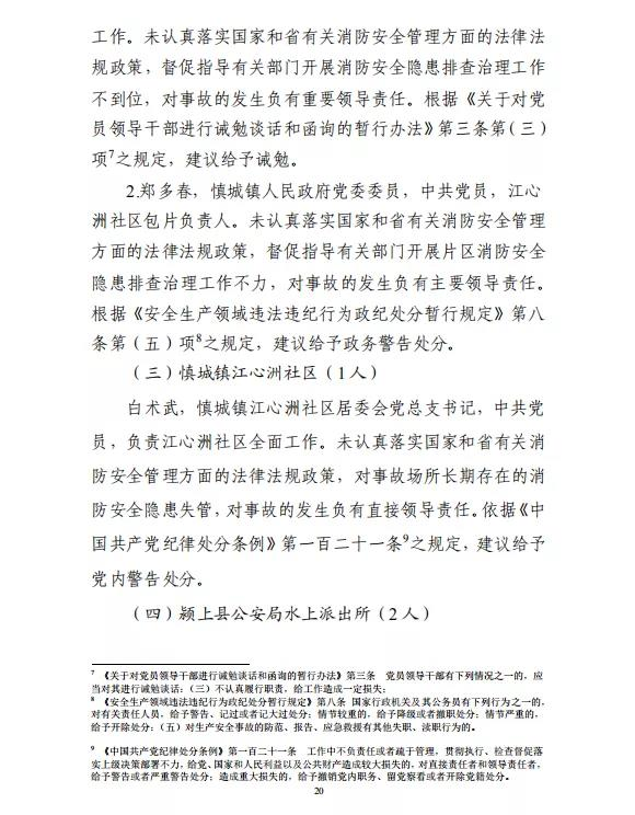 调查报告提出,薄康海对事故发生负有直接责任,鉴于其已在事故中死亡,建议免于追究刑事责任;对事故相关政府、部门(单位)等5名人员分别给予相应的党纪政务处分和实施组织处理;责成江心洲社区向慎城镇人民政府作出深刻书面检查;责成颍上县公安局水上派出所向颍上县公安局作出深刻书面检查;责成慎城镇人民政府向颍上县人民政府作出深刻书面检查。
