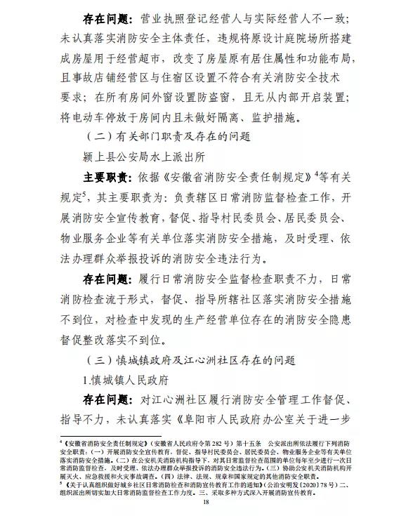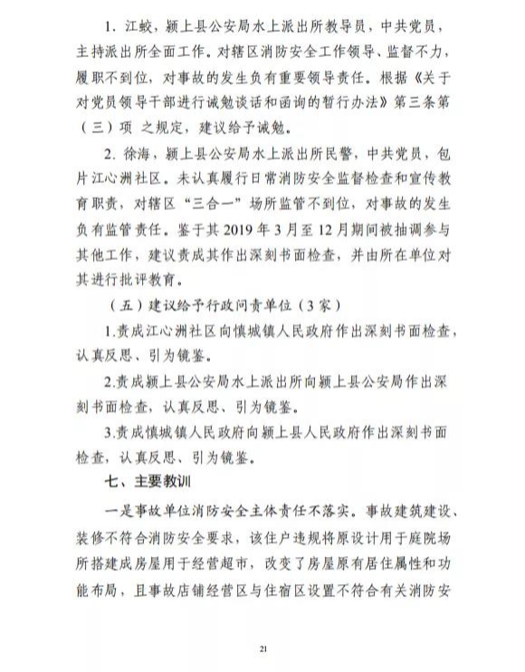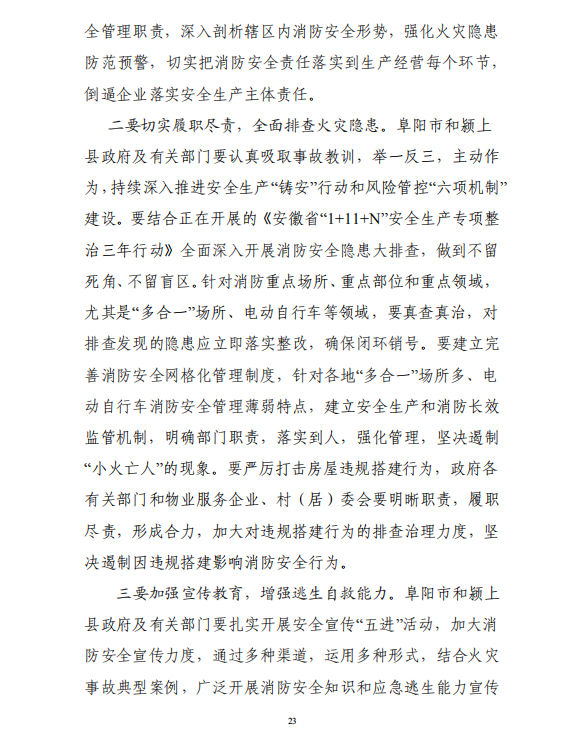 在事故防范措施建议中调查报告要求:阜阳市和颍上县政府及有关部门一要提高政治站位,强化安全责任落实;二要切实履职尽责,全面排查火灾隐患;三要加强宣传教育,增强逃生自救能力。