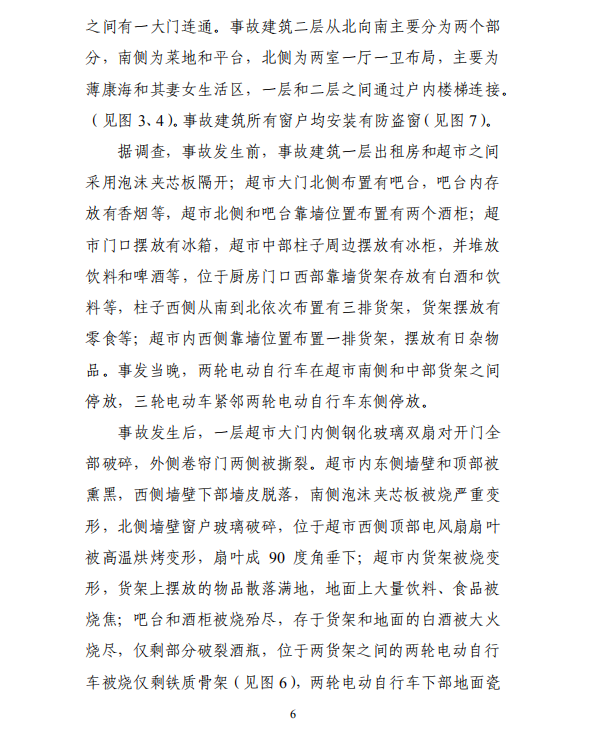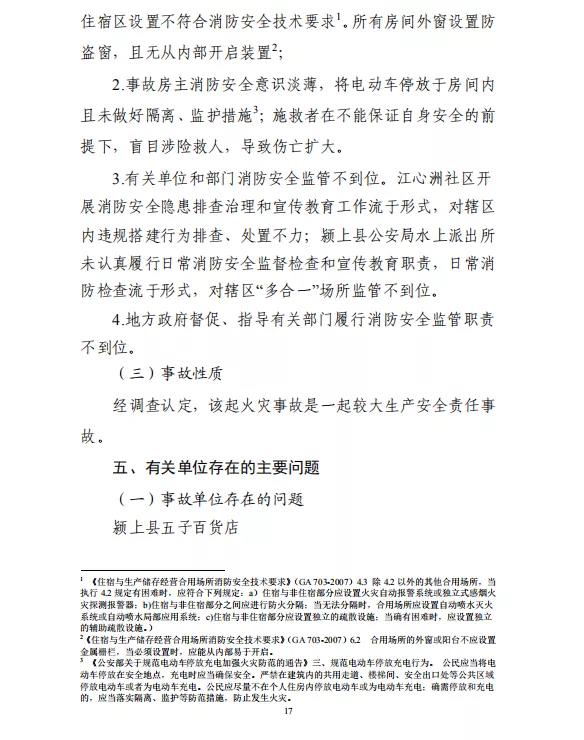 调查报告认定,事故的直接原因为:两轮电动自行车线路短路引发火灾。事故的间接原因为:事故店铺违规改变房屋原有居住属性和功能布局;经营区与住宿区设置不符合消防安全技术要求,所有房间外窗设置防盗窗,且无从内部开启装置;事故房主消防安全意识淡薄,将电动车停放于房间内且未做好隔离、监护措施,盲目施救导致伤亡扩大;有关单位和部门消防安全监管不到位;地方政府督促、指导有关部门履行消防安全监管职责不到位。