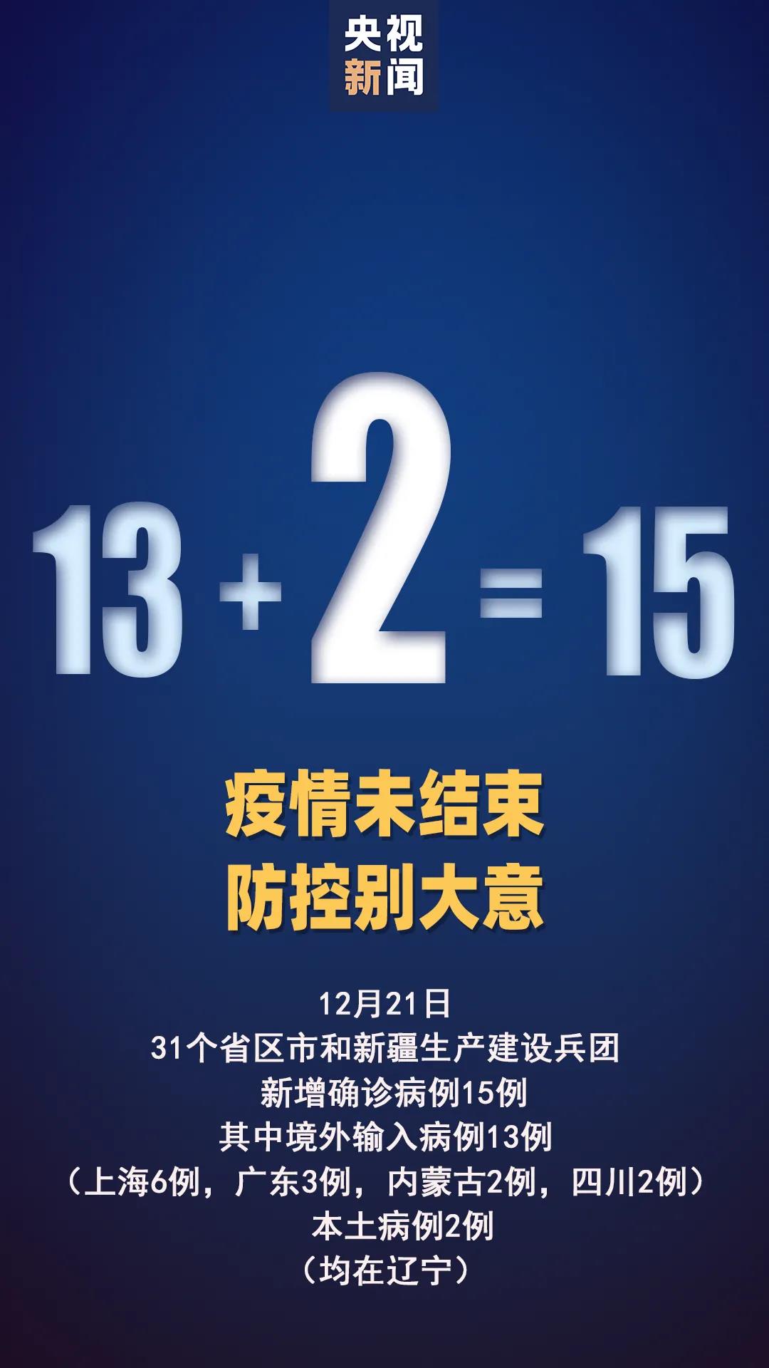 据国家卫健委消息,21日0时至24时,31个省(自治区、直辖市)和新疆生产建设兵团报告新增确诊病例15例,其中境外输入病例13例(上海6例,广东3例,内蒙古2例,四川2例),本土病例2例(均在辽宁);无新增死亡病例;无新增疑似病例。
