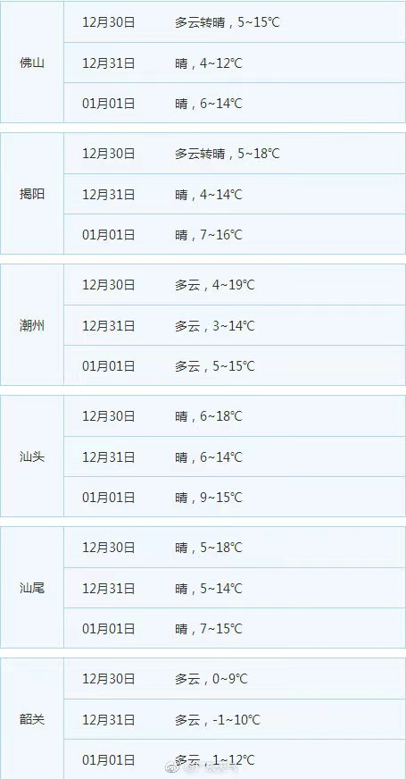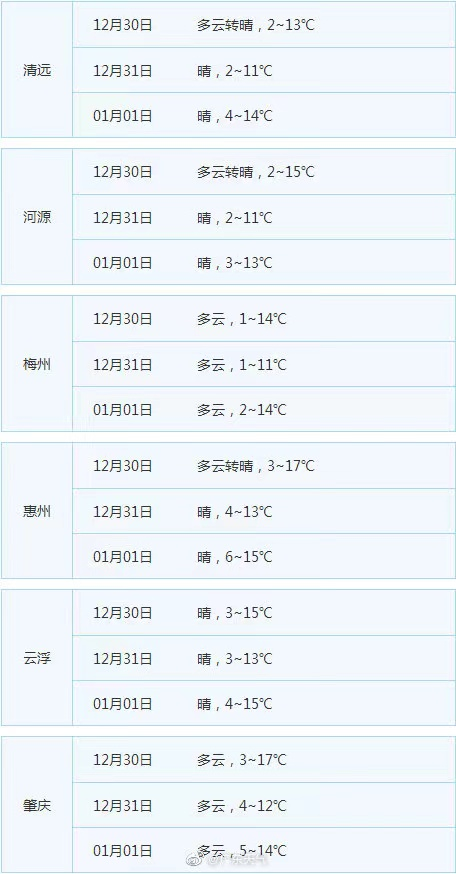 据广东天气,预计,未来三天我省将继续受寒潮影响,12月31日和2021年1月1日粤北市县早晨最低气温降至0℃左右,有冰冻;2021年1月2日-3日,全省晴到多云,天气仍然寒冷。请继续做好防寒防冻防大风工作。