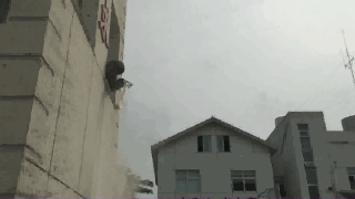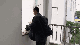 消防员爬上将近3米高的窗户边,从上往下撒玉米粉,我们可以看到,玉米粉一接触到明火,火舌就不断往上蹿。