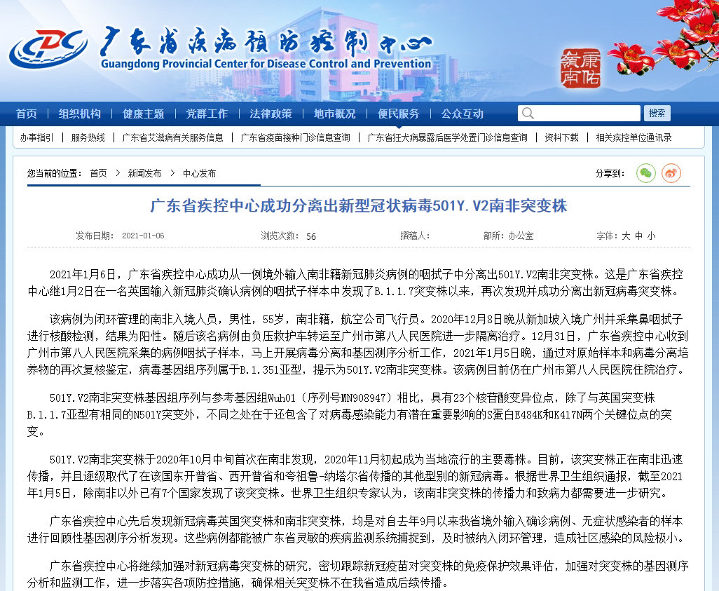 2021年1月6日,广东省疾控中心成功从一例境外输入南非籍新冠肺炎病例的咽拭子中分离出501Y.V2南非突变株。这是广东省疾控中心继1月2日在一名英国输入新冠肺炎确认病例的咽拭子样本中发现了B.1.1.7突变株以来,再次发现并成功分离出新冠病毒突变株。