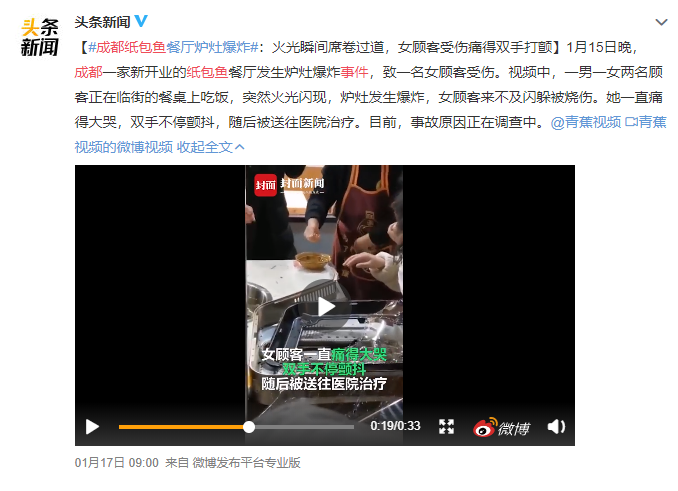 1月15日晚,四川成都一家新开业的纸包鱼餐厅发生炉灶爆炸事件,致两名食客受伤。