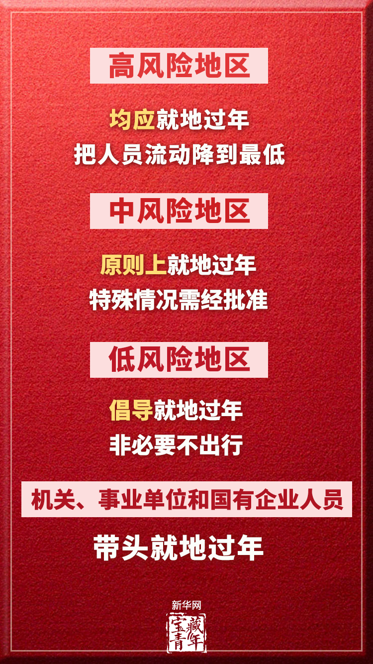一、合理有序引导群众就地过年。疫情高风险地区群众均应就地过年,把人员流动降到最低,防止因人员流动导致疫情传播扩散。中风险地区群众原则上就地过年,特殊情况需要出行的,需经属地疫情防控机构批准。低风险地区倡导群众就地过年,非必要不出行。机关、事业单位和国有企业人员要带头就地过年,引导外地农民工、尚未离校的师生就地过年。确需出行人员原则上不前往中高风险地区。