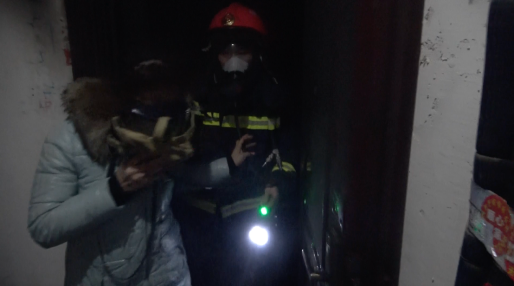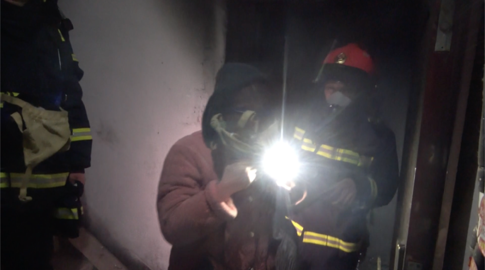 室内虽然火势不大,但是浓烟滚滚,消防人员边出水灭火,边利用救生面罩,将3名被困人员成功救出。
