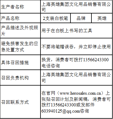 上海英雄集团文化用品销售有限公司宣布召回2019年11月1日生产、规格/型号为893-2的2支装白板笔(生产批号/批次:2019-11-1),涉及1000套。
