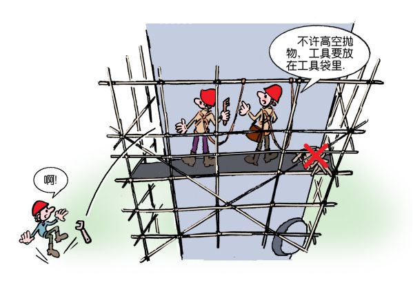 高处作业中应始终注意高处物品的势能,一旦坠落便可能引发事故。要对高处作业相关物品进行清晰的管理和固定,如工具在使用时应系有安全绳,不用时应将工具放入工具套(袋)内。此外,如果高处作业使用脚手架,要注意脚手架的承重状态,尽可能减少同时作业人员和作业器具。