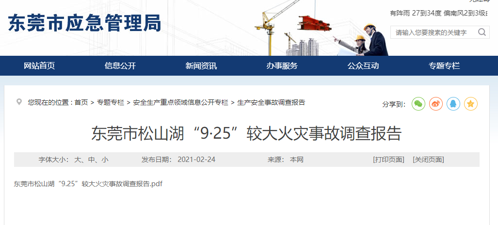 近日,东莞市应急管理局公布了《东莞市松山湖“9·25”较大火灾事故调查报告》。