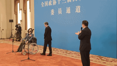 △首场“委员通道”活动上,中国美协主席范迪安推着中国残联主席张海迪退场。