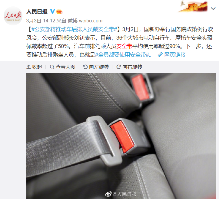近日,国新办举行国务院政策例行吹风会,公安部副部长刘钊表示将推动后排乘坐人员系安全带。