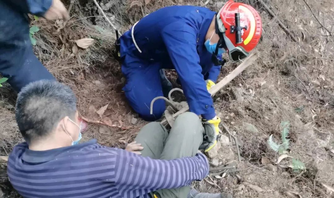 到达被困者所在位置后,经观察,被困者在一陡坡边缘,小腿被捕兽夹紧紧夹住,无法动弹,此时被困者已被夹住已有一个多小时。