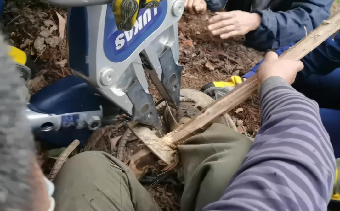 随后,利用电动扩张器对捕兽夹夹口进行扩张,经过20分钟的紧张救援,成功救出了被困人员,由于救助及时,被困者脚部未造成严重伤害。
