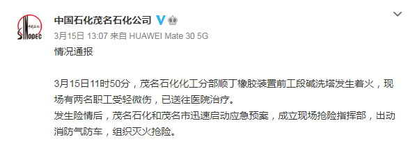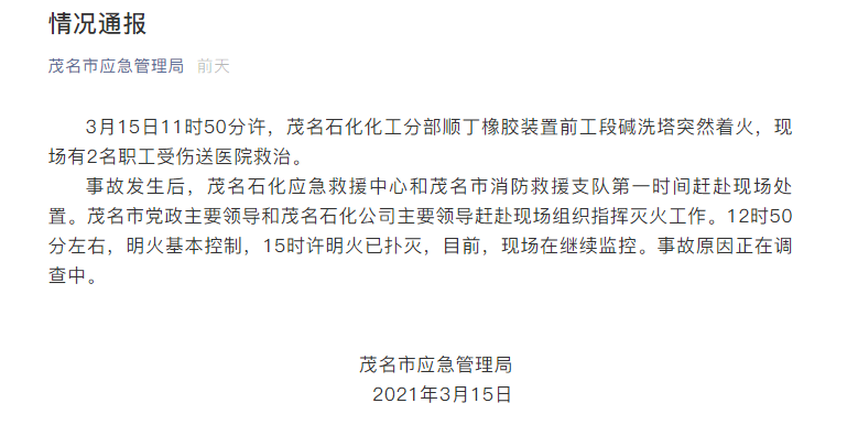 通报介绍,3月15日11时50分许,茂名石化化工分部顺丁橡胶装置前工段碱洗塔突然着火,现场有2名职工受伤送医院救治。