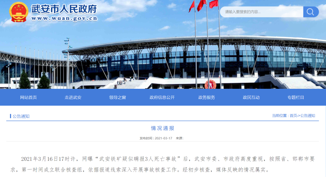 3月17日,武安市人民政府网站发布河北武安团城东铁矿瞒报死亡事故情况通报,全文如下: