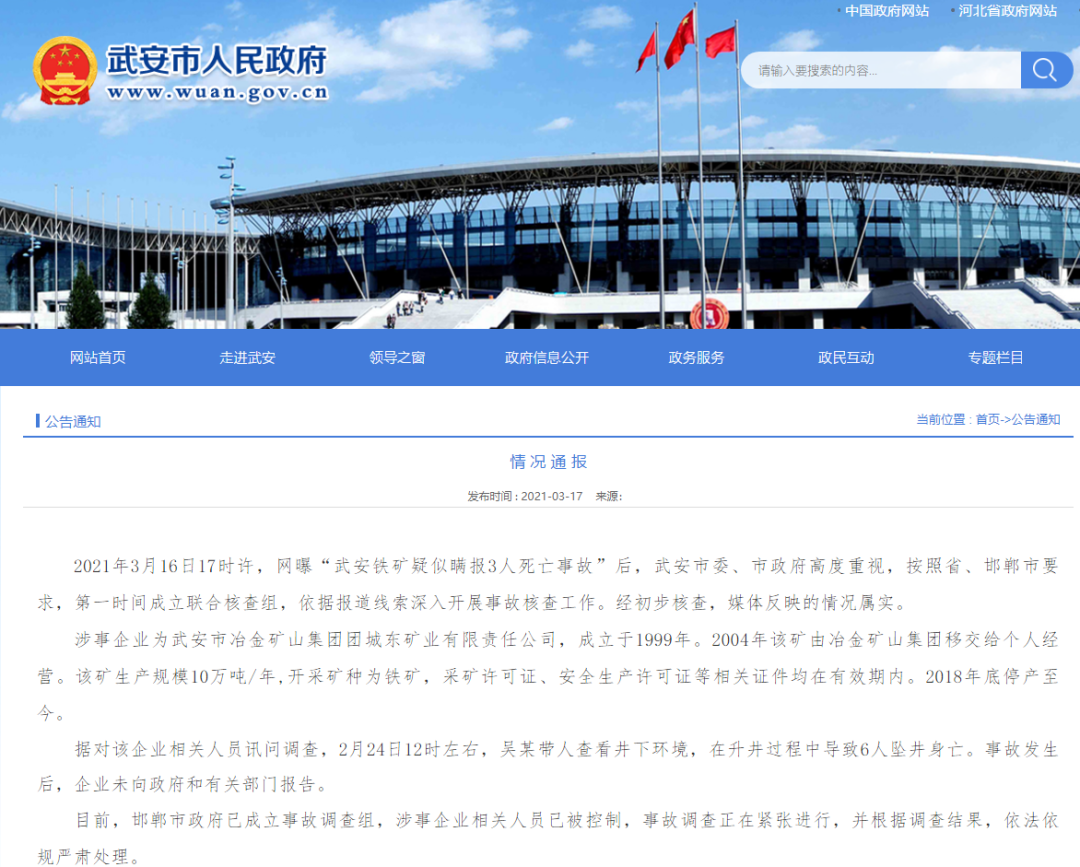 2021年3月16日17时许,网曝“武安铁矿疑似瞒报3人死亡事故”后,武安市委、市政府高度重视,按照省、邯郸市要求,第一时间成立联合核查组,依据报道线索深入开展事故核查工作。经初步核查,媒体反映的情况属实。