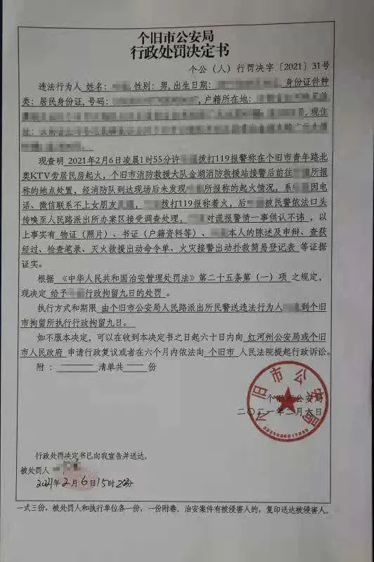 10月7日,公安机关成功抓获谎报火警的犯罪嫌疑人陈某。经审讯,陈某对违法行为供认不讳,公安机关依法对陈某予以行政拘留7日的处罚。