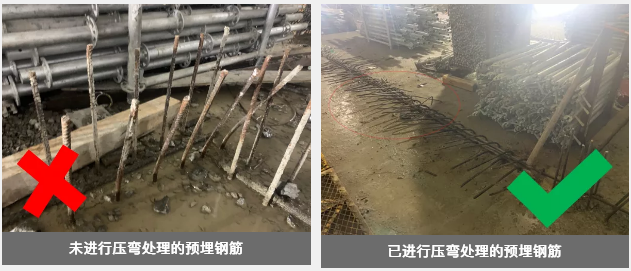施工作业中需要在预埋钢筋周围进行作业的,应先对预埋钢筋裸露部分进行压弯处理,后再进行现场的材料清理、运输,后续需要使用时再对预埋钢筋进行复原处理,以保证作业人员安全。