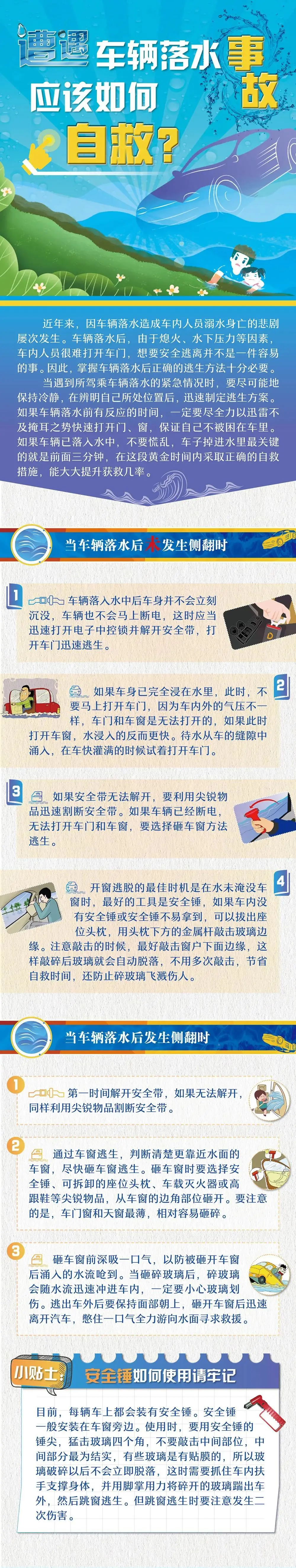 车辆落水后,由于熄火、水的压力等原因,人们很难通过打开车门的方式逃生,如果没有掌握正确的逃生方法,非常容易造成悲剧的发生。其实,车子掉进水里最关键的,就是前面的两三分钟时间。