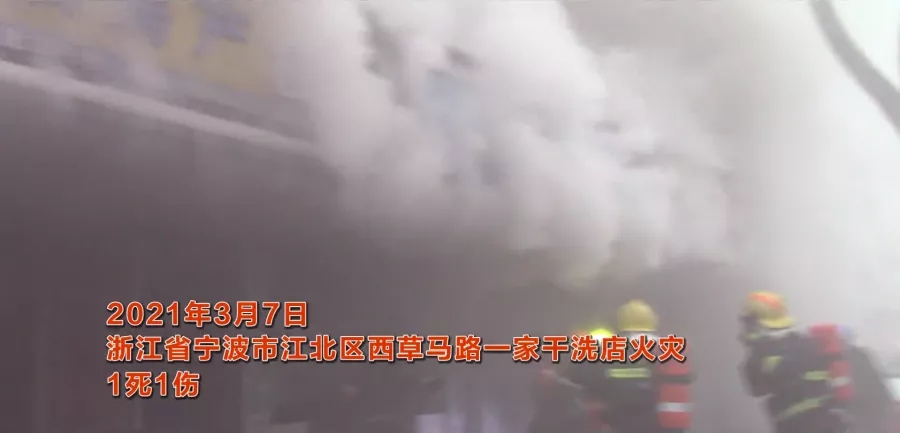 2021年3月7日7时15分,浙江省宁波市江北区西草马路一家干洗店火灾,火灾烧毁(损)家具、家电、生活用品等物品,经消防部门全力抢救,火灾造成一人死亡,一人受伤,该店铺过火面积仅约两平方米,起火原因为烘衣房内高温铁丝网接触部分衣物引发火灾。