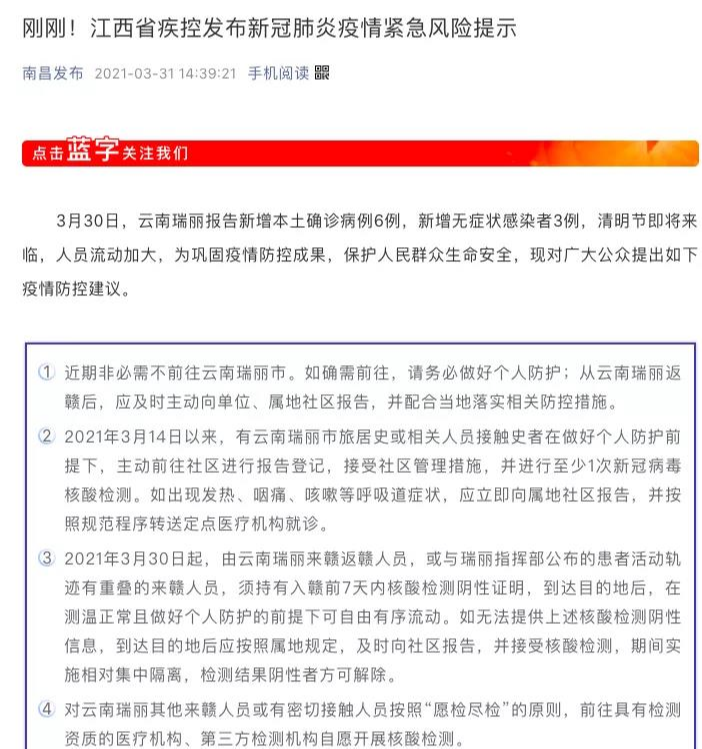 江西省疾控中心还进一步升级了相关防控举措,3月30日起,由云南瑞丽来赣返赣人员,或与瑞丽指挥部公布的患者活动轨迹有重叠的来赣人员,须持有入赣前7天内核酸检测阴性证明。