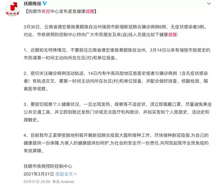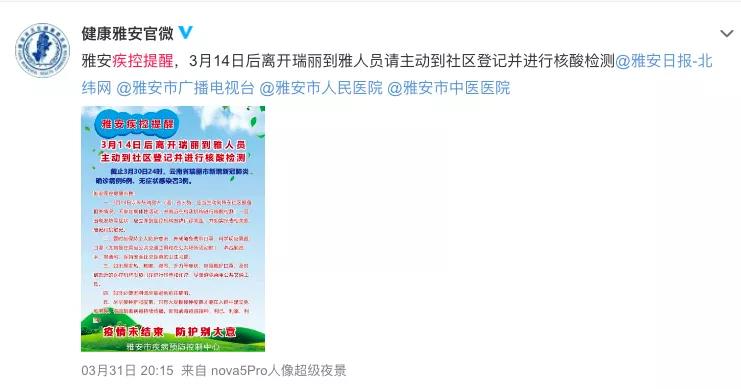 四川雅安疾控中心、辽宁抚顺疾控中心分别发布提醒,3月14日后离开瑞丽到雅安和抚顺的人员,除了要到社区登记外,还要进行核酸检测。