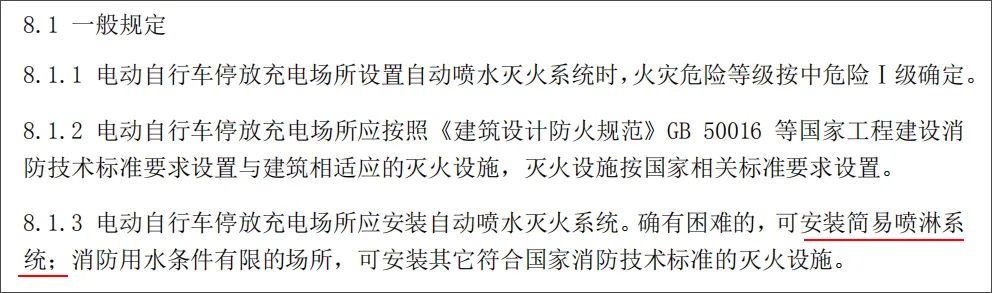2020年11月5日,深圳市发布了《电动自行车停放充电场所消防安全规范》(公开征求意见稿),意见稿第8.1.3条指出:“电动自行车停放充电场所应安装自动喷水灭火系统。确有困难的,可安装简易喷淋系统”。