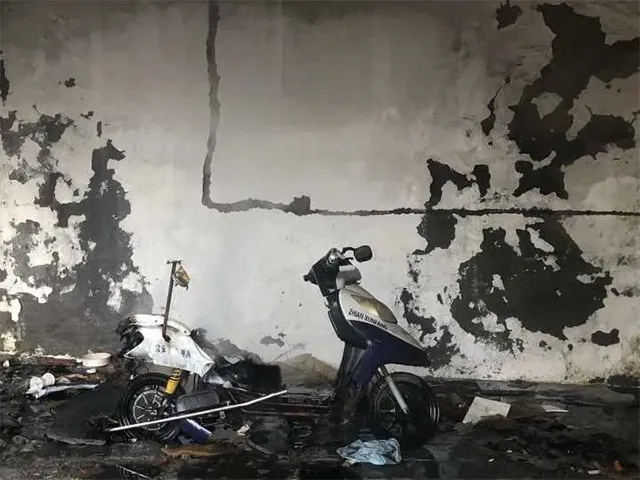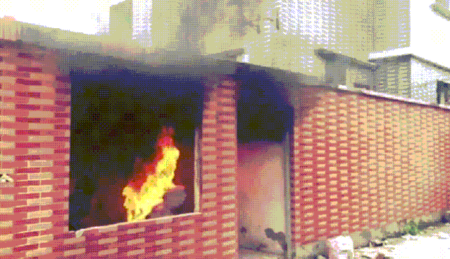 消防实验人员在滨江浦沿一带的拆迁房区域,安装了一套简易的喷淋装置,并在喷淋设施下方模拟了电动自行车起火。