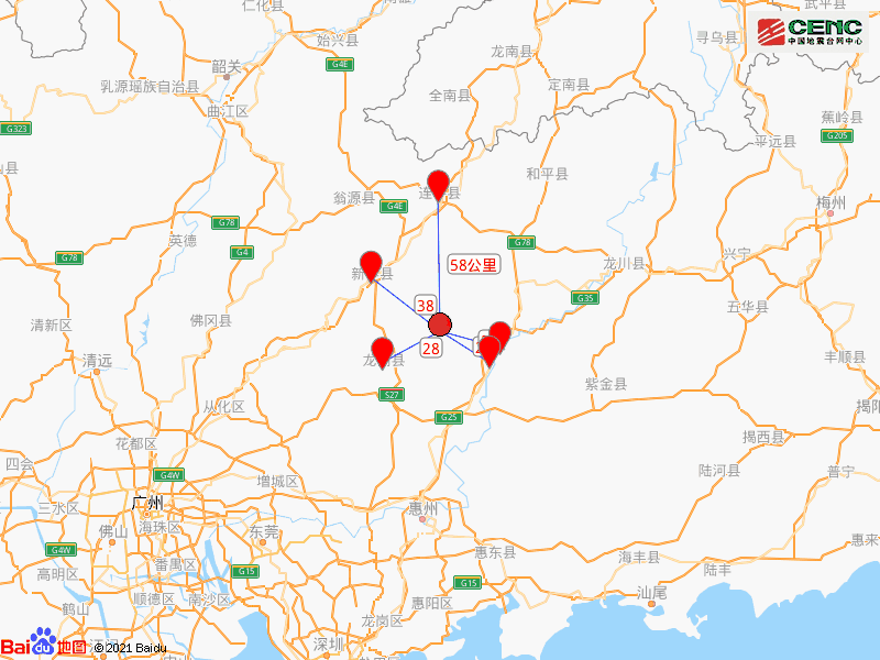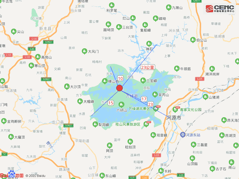 震中距源城区24公里、距东源县26公里、距龙门县28公里、距新丰县38公里、距连平县58公里,距河源市24公里,距广州市149公里。