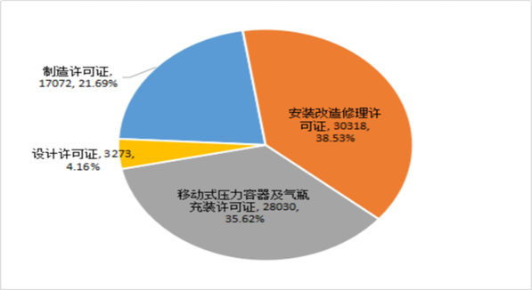 截至2020年年底,全国共有特种设备生产(含设计、制造、安装、改造、修理)和充装单位76219家,持有许可证78693张,其中:设计单位3230家、持有许可证3273张,制造单位16449家、持有许可证17072张,安装改造修理单位30096家、持有许可证30318张,移动式压力容器及气瓶充装单位27012家、持有许可证28030张。(见图2)特种设备作业人员持证1224.51万张。