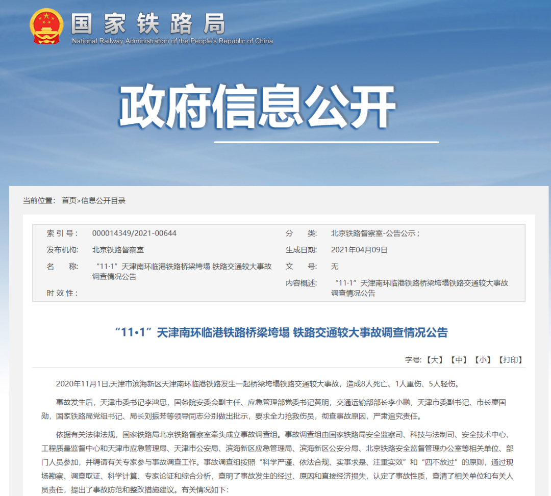 近日,国家铁路局网站发布《“11·1”天津南环临港铁路桥梁垮塌铁路交通较大事故调查情况公告》。