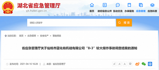 近日,湖北省应急管理厅网站发布《省应急管理厅关于仙桃市蓝化有机硅有限公司“8·3”较大爆炸事故调查结案的通知》。