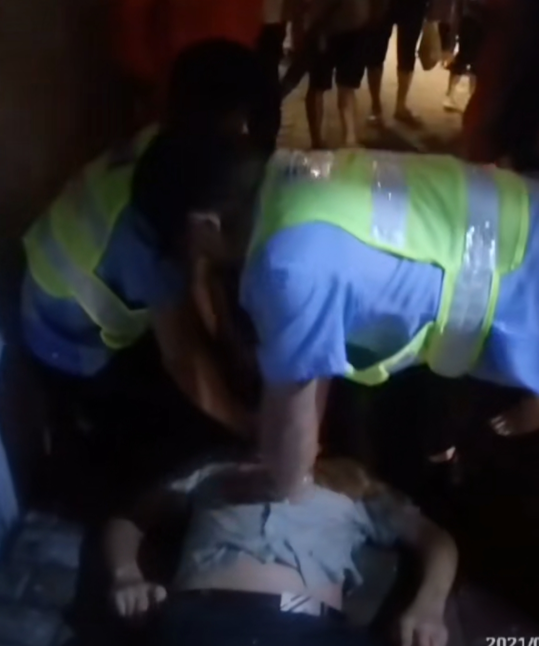 于是,梁文洲与消防救援人员一起,奋力将司机拖出了车外,并与随后赶到的队友一起,三人架着昏迷的男子蹚水朝岸上赶去。仅用了几分钟时间,昏迷男子就被救出积水的隧道。在一处干爽的地面放平邓先生后,梁文洲第一时间撕开了他领口附近的衣服,并让辅警垫高邓先生的头部,开放气道,自己则跪地对邓先生实施胸外按压和人工呼吸。