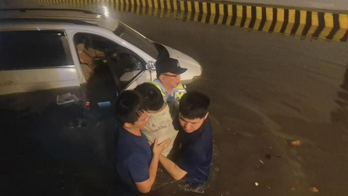 到达后,梁文洲发现,下穿隧道内已大量积水,离出口20多米的位置,一辆白色的面包车被水包围。见此情况,他立即带领队员下车,跑向隧道内被困的车辆。来到车辆附近后,梁文洲跟先期抵达的消防队员一同跨过隧道边的围栏,跳入及腰深的积水之中,并迅速向被困车辆靠近。