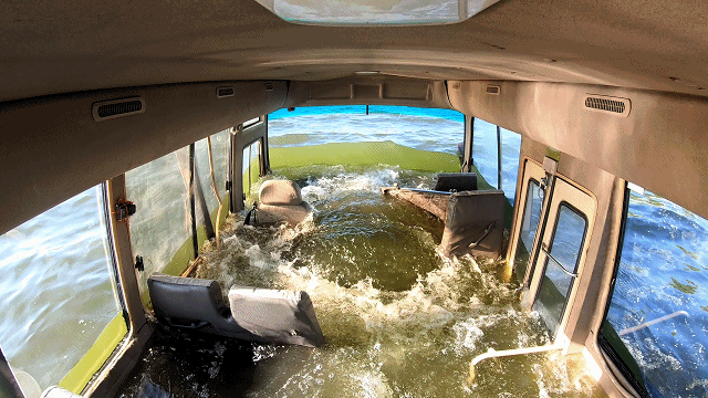 当水位漫过车门时,因为车辆内外存在水压差,此时车门已经很难打开,你要做的就是砸碎车窗,用安全锤、头枕等尖锐的物品,用力敲打侧方玻璃四角,砸碎后迅速逃离。对于普通的私家车,如果对车辆内部结构比较熟悉,也可以尝试从汽车尾部或后备箱进行逃生。因为车头发动机较重,尾部会是最后被淹没的位置。如果错过前面两个时机,你还剩最后一次机会。等待水完全灌入车辆,车内外水压一致的那一刻,深吸一口气,用力打开车门,然后“逃出生天”。如果车门还是打不开,就要用脚狠踹,因为破窗已经很难,头枕和安全锤砸车窗未必会成功,尝试使用灭火器等重物猛砸,破窗几率更大。总结:车辆涉水最最重要的是——尽快离开车辆,这样才有最大的逃生机会。车子落水之初——迅速开门开窗逃离;水已经漫过车门——砸碎车窗玻璃逃生;水即将灌满车辆——憋气用力开门逃生。一定要保持镇静,有序地、相互协助就近快速逃生。比如,你本来坐在窗户旁边,遇到险情可以利用安全锤从窗户快速逃生,千万不要都涌向车门,这样不仅可能无法成功逃生,还有可能造成踩踏。从车内逃脱后,脸部应尽量朝上仰起,用双脚向下踩水,双手横向划水,这样能让自己浮到水面上。同时,应迅速寻找周围的漂浮物帮助自己,给接下来的求救创造条件。