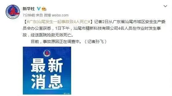 5月1日上午,汕尾精新科技有限公司4名作业人员在完成水箱PVC水管连接件更换、水箱修补作业后离开水房。下午2时15分左右,4名作业人员陆续进入水房进行水箱清洗作业。4时20分,该厂区设备科科长发现4名作业人员趴在水箱底部水面上(水深约50厘米),后经抢救无效死亡。