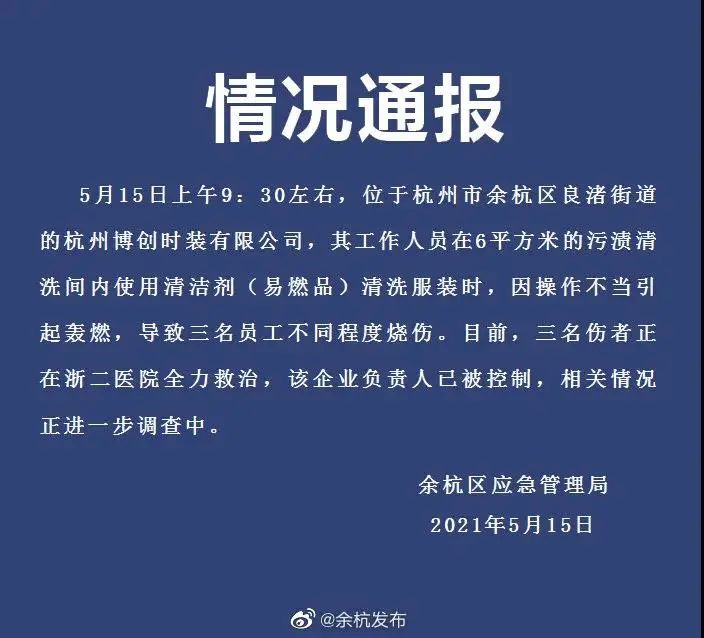 杭州市余杭区应急管理局5月15日发布情况通报,当日9时30分左右,位于当地良渚街道的杭州博创时装有限公司,其工作人员在6平方米的污渍清洗间内使用清洁剂(易燃品)清洗服装时,因操作不当引起轰燃,导致三名员工不同程度烧伤。