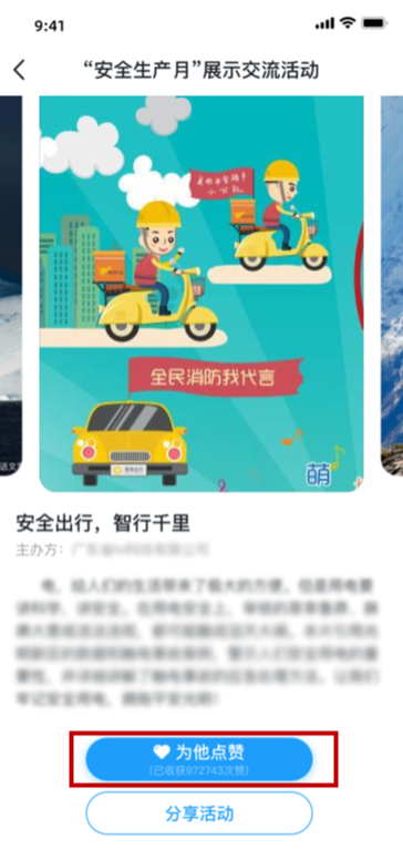 用户能够通过列表页及详情页“为他点赞”按钮,为作品点赞。点赞操作仅能通过“学习强安”APP进行。