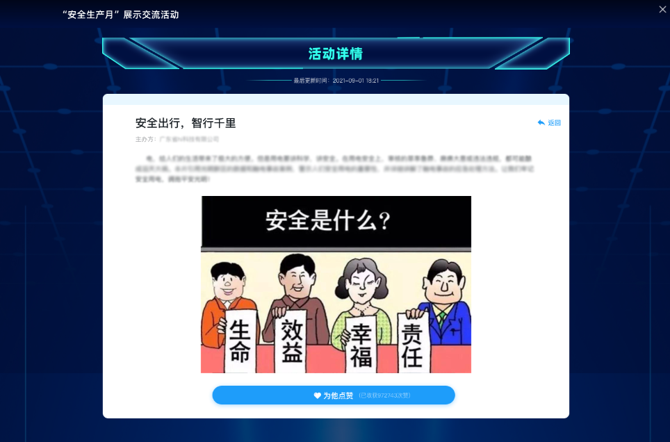 各地区、各有关单位可以通过全国安全生产月官网及“学习强安”APP上传2021年“安全生产月”期间开展的线上线下宣教活动,由全国网民通过“学习强安”APP对喜爱的活动点赞。