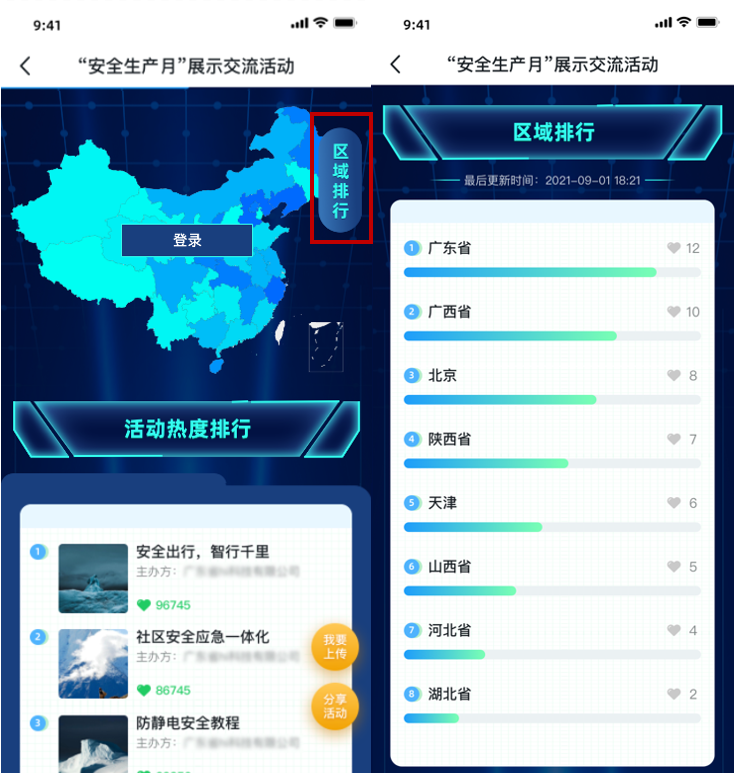 用户每为一个作品点赞,就可以对作品所在省份增加1点热度。可以通过首页的热度图直观查看各省份热度情况,也可以通过排行榜查看各省热度排行情况。
