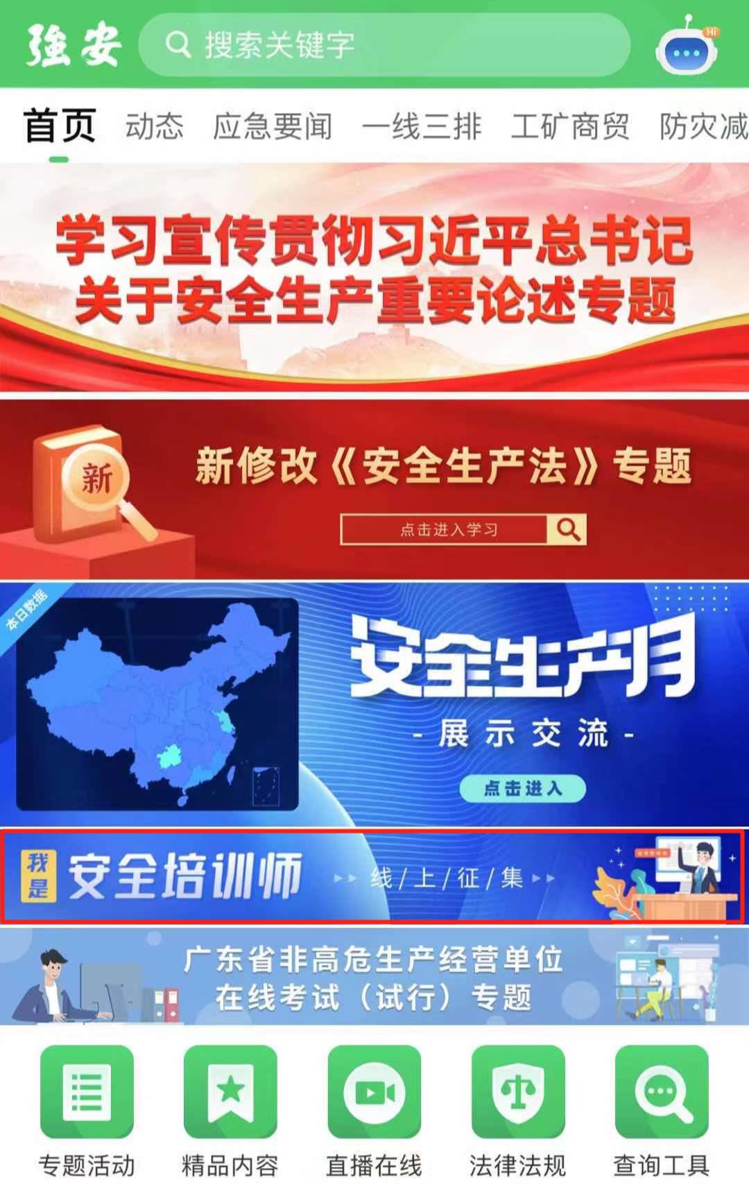 打开“学习强安”APP,点击首页的活动封面“我是安全培训师”线上征集活动(如图所示),点击进入。
