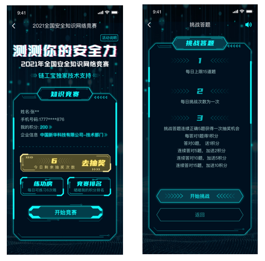 参赛者通过答题过关的形式测试安全力,每天可挑战答题1次,最多答15题,每答对5题可获得1次抽奖机会。