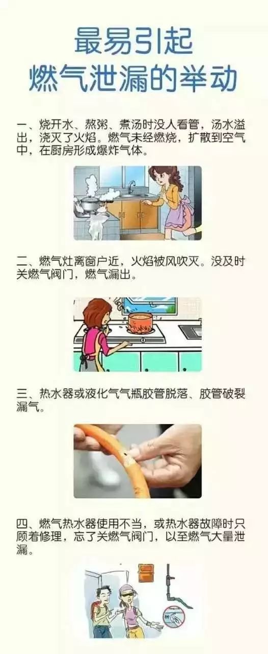 3.杜绝一切可能产生火花的行为,严禁在室内开启各种电器设备,如打电话、开关灯具、开启排气扇或抽油烟机,以及穿脱化纤衣服等,若发现邻居家燃气泄漏,应敲门告知;