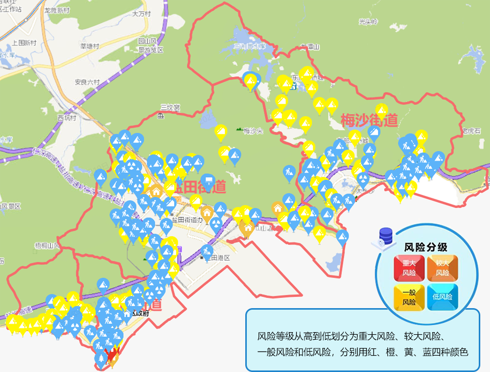 为深入贯彻落实习近平总书记关于应急管理工作的重要论述精神,构建“大应急大安全”框架,盐田区把应急管理信息化摆进盐田区智慧城市建设整体规划,坚持一体化建设一体化运转,全力提升全区安全态势感知水平和应急指挥调度能力。立足具体业务,锚定风险隐患身份证管理体系,持续推动前端感知设备建设,依托大数据、人工智能、物联网等前沿技术推进盐田区智慧安全风险管理平台建设,纳管房屋安全、地面坍塌、地质灾害、消防安全、树木安全等19类公共安全、自然灾害领域风险隐患,划定风险等级,赋予身份证编码,公开责任清单,与盐田区智慧安监系统形成互补,动态感知、实时管控安全生产类、自然灾害类、公共安全类风险隐患,将全区风险隐患一网打尽,进一步织密大应急大安全网络。