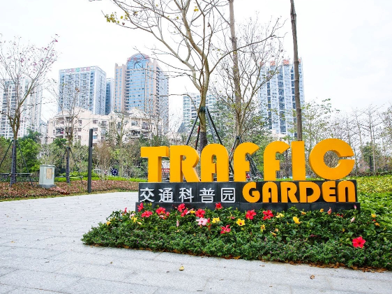 占地面积1500平方米,其融合了许多法治交通元素,为群众打造了喜闻乐见、寓教于乐的文明交通法律法规宣传阵地。园里的迷你建筑充满童趣,颜色鲜艳、活泼。园内交通信号灯、斑马线,黄色网格线、交通转盘、防护栏等设施,模拟的道路上方架设起迷你“人行天桥”,路边24个交通指示标牌等靓丽醒目的交通标志,特别设置的红色双层大巴“交通科普园”,营造起了集知识性、竞技性、趣味性于一体的交通法规科普氛围。公园通过“一路一街”项目设计,为社区居民提供了一个生动形象、元素丰富的交通科普和户外实践场所。