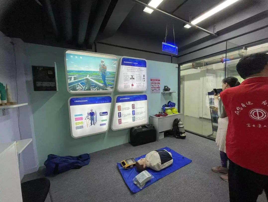 面积约 320平方米,体验区分为听力防护、眼面防护、呼吸防护、手/足防护区、心肺复苏与海姆立克急救体验等专区,各项功能系结合工厂当前各生产制程相对典型的危害因素而设定。体验馆主要面向企业一线职工开展职业健康安全体验活动,旨在提高职工职业健康自我防护及应急互救能力。同时与园区内龙华消防中队应急科普基地联动合作,共享资源,开展隐患排查、模拟灭火、模拟报警、厨房灭火、电动车起火、触电体验等消防科普项目。配有专兼职专业指导老师9人,年接待能力达10000+人次。