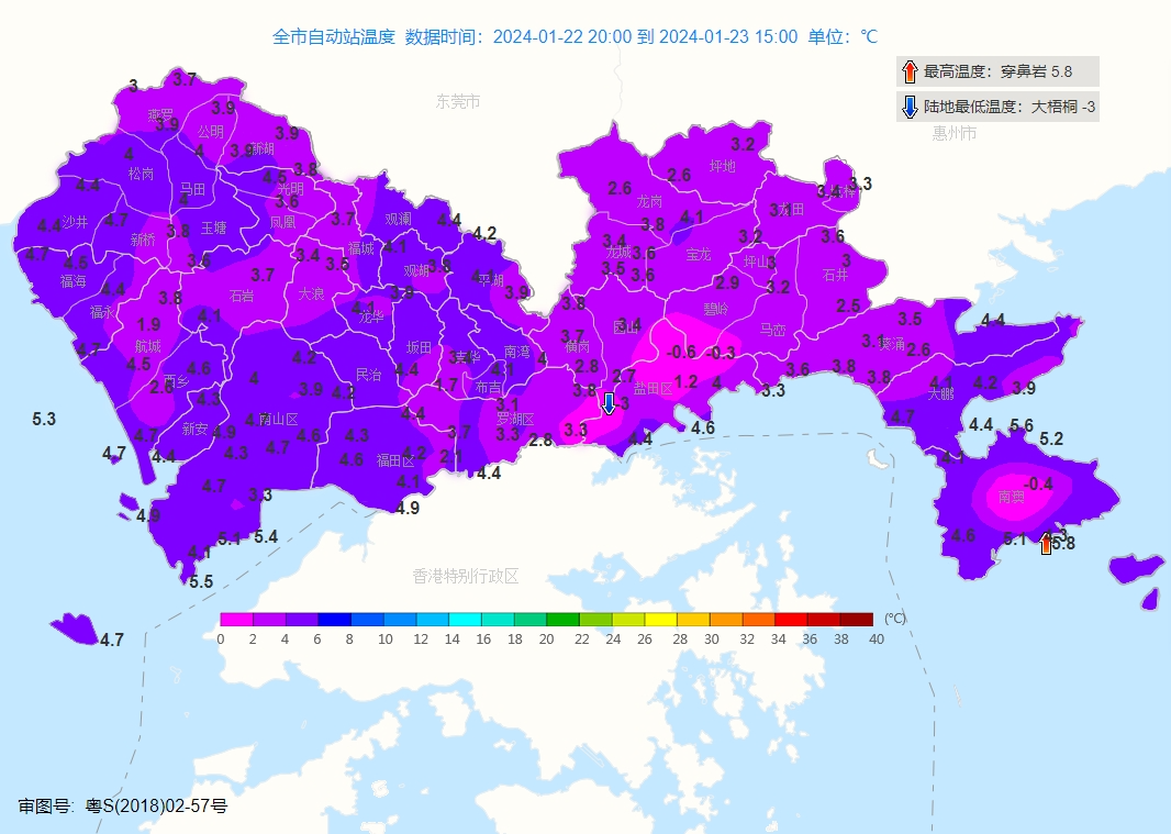 受强冷空气主体影响,1月22日至23日上午,我市气温持续偏低,深圳福田国家基本气象站23日最低气温4.4℃(23日06:49),罗湖大梧桐高山站最低气温-3.0℃(23日08:31)。
